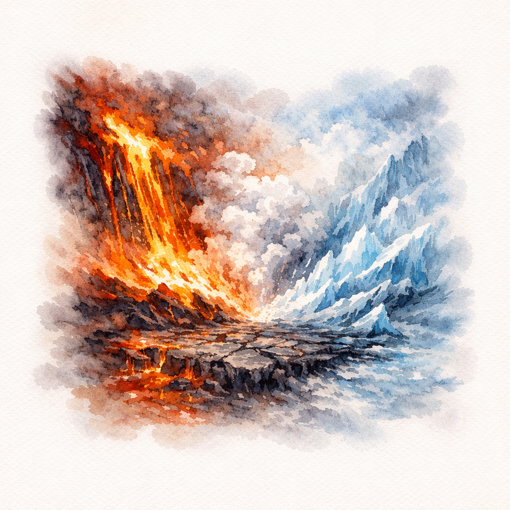 Buzun üstüne lav döküldüğünde buzu aniden eritir, ince bir buhar tabakası oluşur ancak buz da lavı anında soğutur ve sertleşmesine neden olur. Tüm bunlar olduğunda artık ortada ne buz kalmıştır ne de bir lav. İkisinin savaşında taraflar birbirlerini maddesel olarak yok etmiştir. Su buharlaşıp evrende kaybolmuştur; lav sertleşip kıvamlı halinden uzaklaşmıştır.